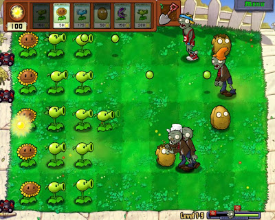 To plant stuff you need "suns," which you gather by either planting sunflowers (with their adorable grins) or picking them up during daytime levels (which means they were literally dropped from the sun). Having to click on suns keeps it interactive, even during the boring beginning stages of the levels, where you are trying to gain a steady income as fast as possible. After that you have basic pea shooters which will slowly fire on advancing zombies, wall-nuts (which also have adorable grins, just look at them!) that block the zombie's paths, and more. The game keeps introducing a new plant nearly every level, which in turn adds a new strategy to attempt. The pacing is exactly perfect, and by the end you'll be juggling nine different plants, fighting off tons of zombies, and it'll all be completely intuitive. IT may look overwhelming at first, but Plants vs Zombies hits the sweet spot: it's never too hard, and it's never boring. And it rewards you just enough to make you keep on playing for hours and hours on end.